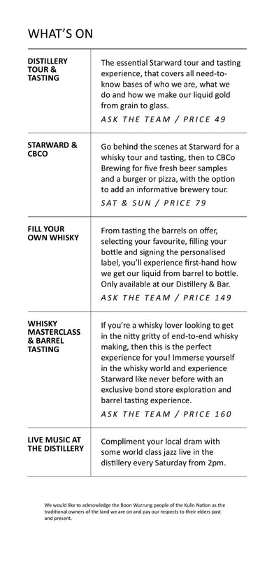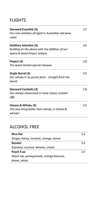Our Bar & Tasting Menu is all about approachable, delicious dishes paired perfectly with our whiskies. Whether you're here for a casual sip, a bite with friends, or to try something new, there's always something to surprise and delight your taste buds. From creative food pairings to classic whisky favorites, we've got the perfect match for every mood and moment.